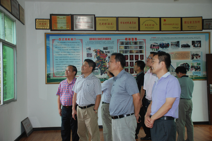 图为英山县温泉镇党委书记段宇新(右一)向山河集团董事长程理财(左二)一行人员介绍百丈河村基本情况及荣誉