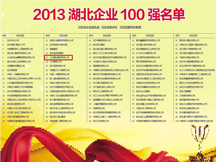 10月22日,2013湖北企业百强发布会、第十八届湖北省优秀企业、优秀企业家表彰大会暨八届二次会员代表大会隆重举行。湖北省企业联合会、湖北省统计局和湖北日报传媒集团联合发布了2013湖北企业100强名单,山河集团位列湖北百强企业第25位并荣获“第十八届湖北省优秀企业(金鹤奖)”。山河集团董事长程理财同时被湖北省企业联合会和湖北省企业家协会联合授予“第十八届湖北省优秀企业家(金牛奖)”荣誉称号。