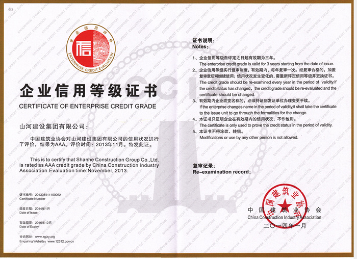 全国建筑业AAA级信用企业由中国建筑业协会颁发,是建筑行业信用最高奖项。此次评价严格按照《建筑业企业信用评价试行办法》规定的程序进行。经企业自愿申报、各地区和有关行业、建筑业协会推荐、在建设系统相关网站上排查、专家评价组初评、全国建筑业企业信用评价工作指导委员会审定和网上公示。通过层层筛选,最终,包括山河建设集团有限公司在内的93家企业评定为2013年度全国建筑业AAA级信用企业。