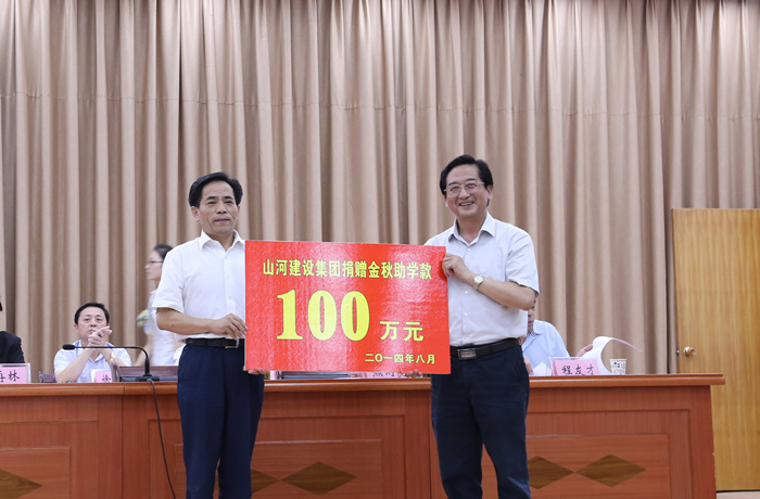 8月28日上午,“山河扶贫助学”资助仪式在黄冈市委小礼堂举行,山河集团捐资100万元资助贫困学生,加上8月22日向团风县捐助的80万元,今年山河集团共捐资180万元作为2014年贫困学生救助资金。这是山河集团与黄冈市总工会联手扶贫助学的第九年。