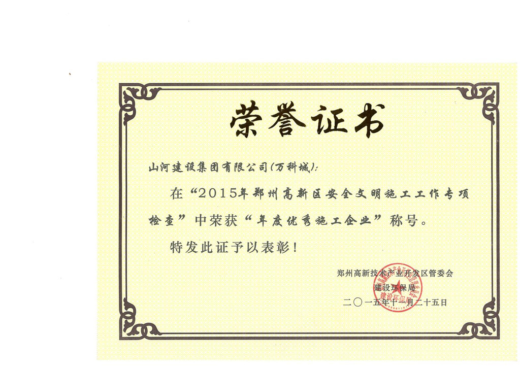 11月25日,在郑州高新区安全文明施工专项检查中,山河建设集团有限公司荣获由郑州高新区管理会建设环保局授予的“年度优秀施工企业”荣誉称号。