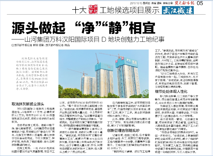 汉阳龙阳大道与陶家岭路交汇处,山河集团承建的万科汉阳国际项目D地块3栋超高住宅楼已巍然挺立。该项目部从源头抓起,创新管理和建造模式,长期将工地PM10控制在80以内,噪音控制在60分贝以下,让整个工地既干净,又安静。