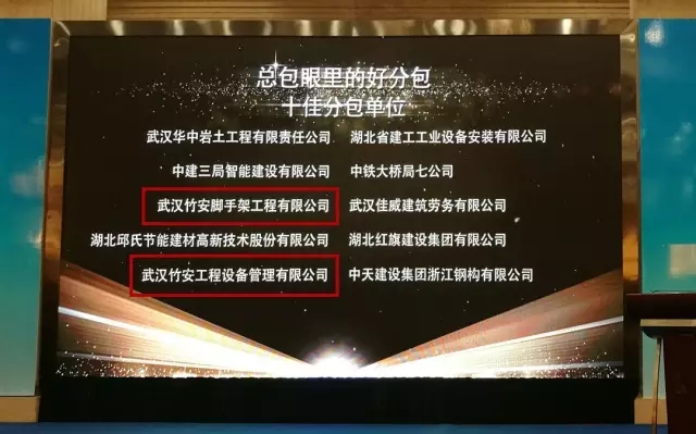 今日,武汉建筑业协会在光谷金盾大酒店三楼举行2015年总分包互评颁奖典礼活动。山河集团获颁“十佳总包”,集团旗下公司竹安脚手架与竹安设备则获颁“十佳分包”,双双上榜。