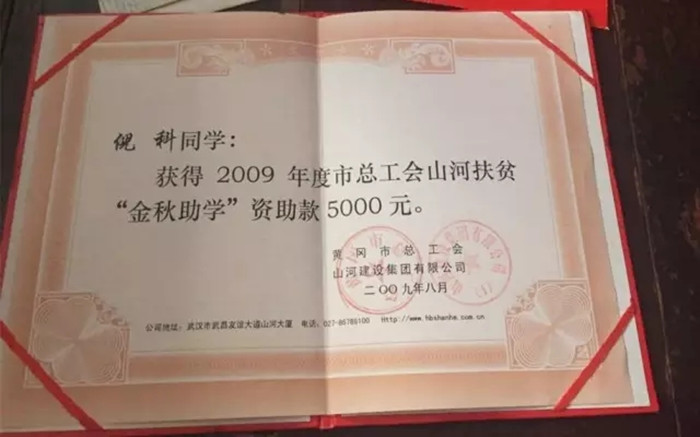 倪科全家6口人,年近九旬的爷爷奶奶长年卧病在床,父母是黄州区食品公司下岗工人,哥哥患有脑瘫,家境一直十分窘迫。2009年,倪科考上清华,在市总工会的帮助下,他申请到山河集团5000元的助学金,顺利地走进了大学校门。