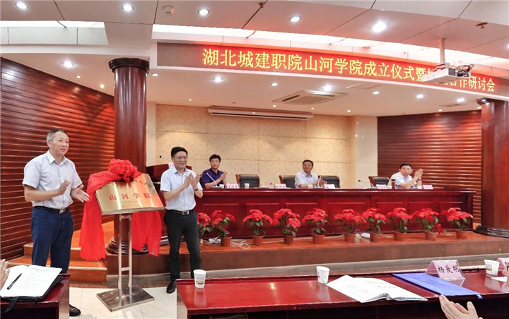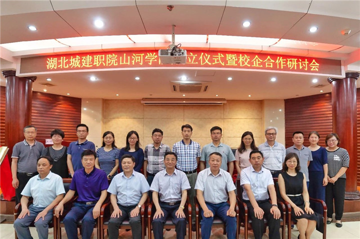 6月8日下午,位于风景秀丽的武汉东湖高新技术开发区藏龙大道,在湖北城市建设职业技术学院培训中心大楼里,山河集团党委书记、董事长程理财与湖北城市建设职业技术学院党委书记程超胜共同为“山河学院”揭牌。这标志着山河集团打造人才梯队建设、实施人才兴企战略,在湖北城建职院设立“山河学院”的校企合作正式启动。