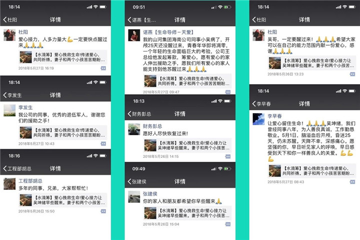 他的遭遇牵动着海南公司原同事们的心。海南公司员工纷纷自发为他募捐,并争相用微信转发他的病情,集团员工朋友圈一度被自发援助吴坤绪的爱心举动刷屏。
