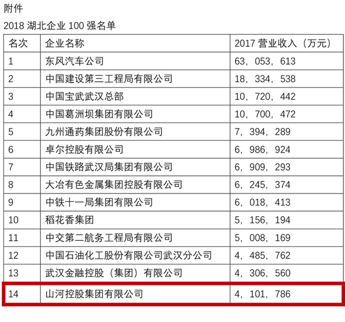 “荆楚百强,再立潮头。”7月20日,山河控股集团以2017年度营业收入410.1786亿元的实绩再次上榜“2018湖北企业100强”,名列第14位,较去年第16位再次上升2个位次。当天,湖北省企业联合会、湖北省企业家协会公布了这个令山河人振奋的消息。
