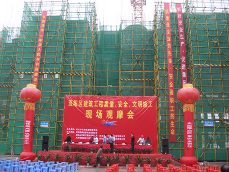 为进一步全面提高汉阳区建筑工程质量、安全、文明施工水平,汉阳区建管站于2006年10月17日上午,在湖北山河集团水墨丹青项目部工地现场召开了质量、安全、文明施工现场观摩会。市建管办、市市场站、市质监站、市安全站,汉阳区委、区政府、区人大、区政协有关领导均到会表示祝贺。汉阳区各建设单位、施工单位、监理单位相关负责人参加了会议。