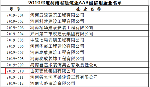 [河南公司]山河集团河南公司上榜河南省2019年度建筑业AAA级信用企业