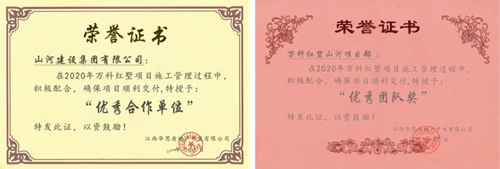 4月9日,山河建设集团江西公司被江西华思房地产开发有限公司授予“优秀合作单位”称号,表彰江西公司承建的万科红墅项目在施工管理过程中积极配合,确保项目顺利交付。同时,万科红墅山河项目部荣获“优秀团队奖”。