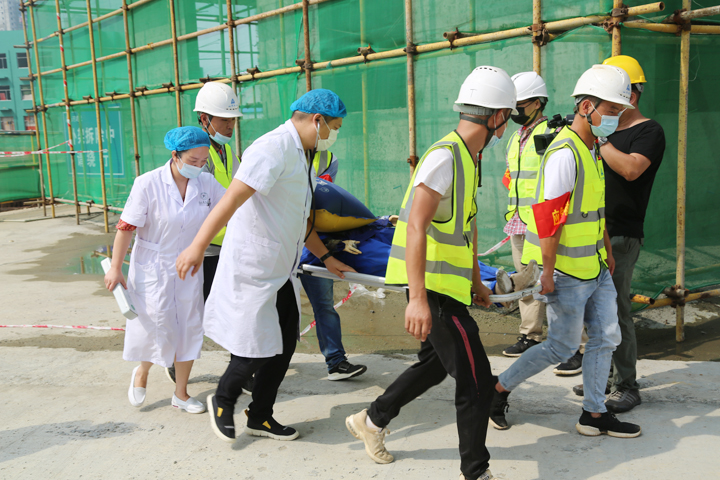 救护车闪烁着红灯疾驰而来,医护人员带着担架、急救医疗设备一路小跑进入事故现场,对受伤“工人”进行初步包扎处理后,将其抬上救护车并安排专人陪同送往医院。