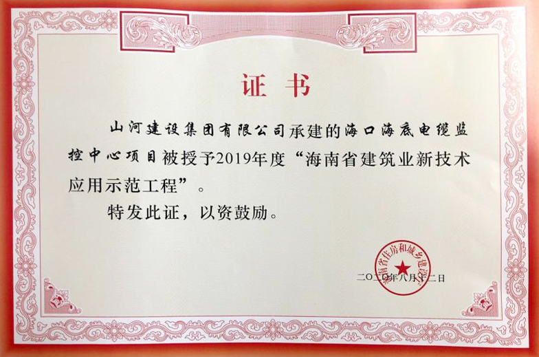 8月10日,海南省住房和城乡建设厅公布2019年度“海南省建筑业新技术应用示范工程”名单,山河建设集团海南公司承建的海口海底电缆监控中心项目名列其中。