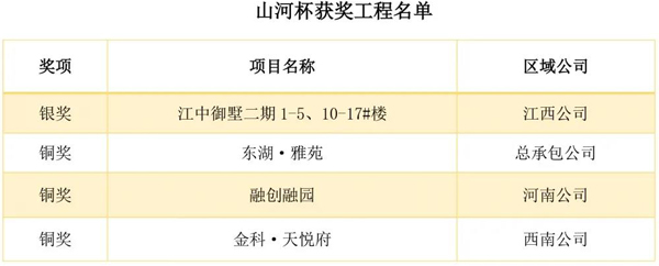 山河杯:“山河杯”是集团工程质量最高奖项,要求申报项目达到一定规模,完成竣工验收备案,经过一年使用没有发现质量缺陷和质量隐患,获得项目所在地优质结构工程、优质建筑工程质量奖项等。