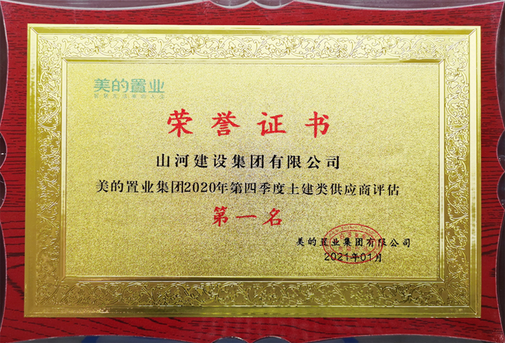 在美的置业集团最近的供应商季度评估中,山河建设集团获得土建类供应商评估第一名。作为美的置业集团战略供应商,双方在广东、江西、江苏、重庆等地展开深度合作,构建了稳定的战略合作伙伴关系。集团承建项目多次获得国家及省市级荣誉,在美的置业的各类评比中名列前茅。
