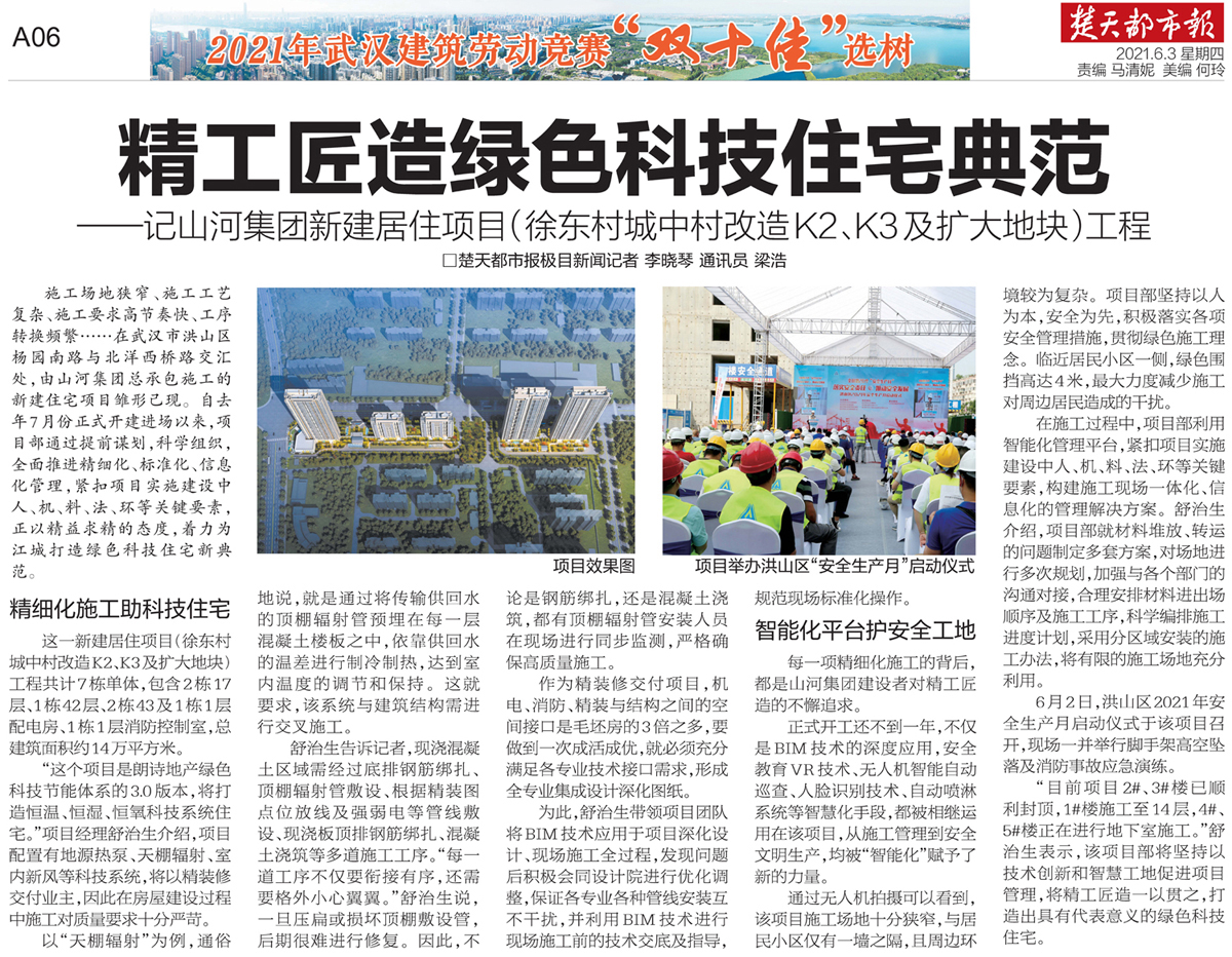 施工场地狭窄、施工工艺复杂、施工要求高节奏快、工序转换频繁……在武汉市洪山区杨园南路与北洋西桥路交汇处,由山河集团总承包施工的新建住宅项目雏形已现。自去年7月份正式开工以来,项目部通过提前谋划,科学组织,全面推进精细化、标准化、信息化管理,紧扣项目实施建设中人、机、料、法、环等关键要素,正以精益求精的态度,着力为江城打造绿色科技住宅新典范。