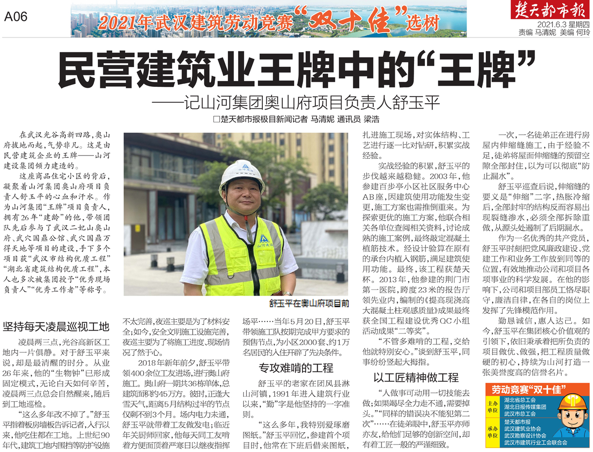 勤恳诚信,惠人达己。如今,舒玉平在集团核心价值观的引领下,依旧秉承着把所负责的项目做优、做强,把工程质量做硬的初心,持续为山河打造一张美誉度高的信誉名片。