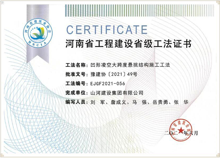 近日,河南省建筑业协会公布了《2021年度第一批河南省省级工法名单》,山河建设集团河南公司申报的《凹形凌空大跨度悬挑结构施工工法》成功入选,被认定为河南省工程建设省级工法。