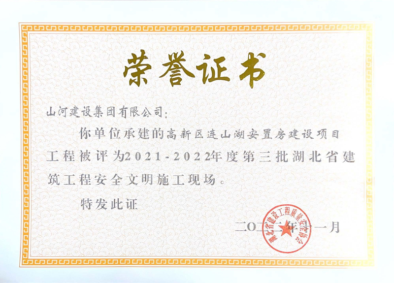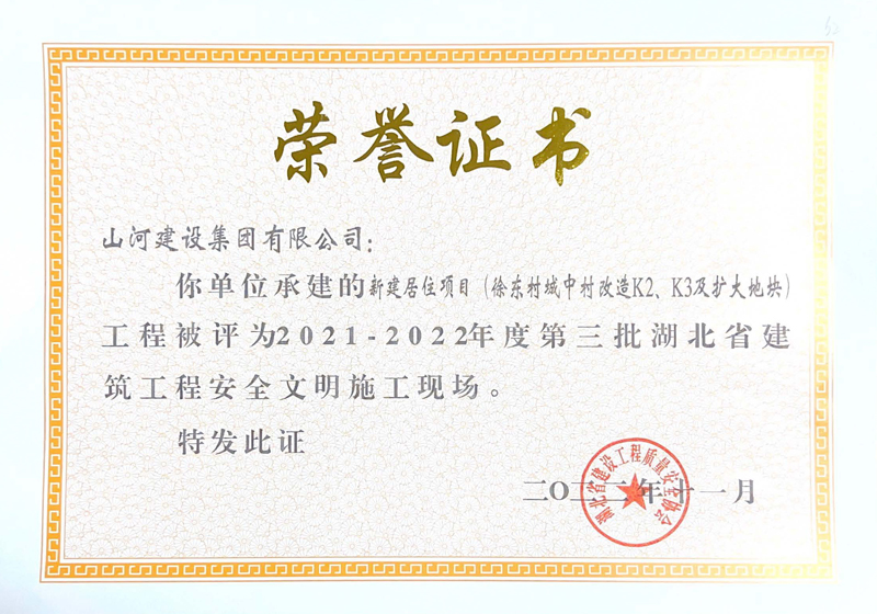 近日,湖北省建设工程质量安全协会公布《2021-2022年度第三批湖北省建筑工程安全文明施工现场》名单,山河建设集团承建的湖北交投产城华园二期,徐东村城中村改造K2、K3及扩大地块(朗诗·熙华府),襄阳高新区连山湖安置房建设项目三项工程名列其中。