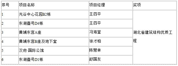 2008年4月9日,《湖北日报》第六版专版刊登《湖北省建设工程质量安全协会公告》。根据《湖北省建筑结构优质工程评审办法》,湖北省建设工程质量安全协会组织开展了2007年度省建筑结构优质工程评选活动,经对申报工程初审、核查和省建筑优质工程评审,全省有323项工程荣获2007年度湖北省建筑结构优质工程奖,其中,山河集团有光谷中心花园、东湖壹号、黄埔东宫、汉府・国际公馆等6项工程获此奖项。具体如下表:
