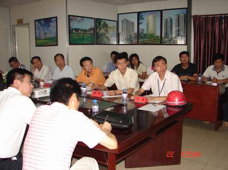 山河集团航天双城项目创国优工程汇报会于2008年6月22日在航天双城项目部会议室召开。出席本次会议的有武汉市质量监督站领导何水桥、郑祥斌同志;江岸区建筑管理站领导胡直刚、王先训、李斌等同志;武汉三江东立投资发展有限公司李副总及监理公司工程师欧阳斌、方军华等同志。集团公司航天双城创国优领导小组舒先厚、黄林、王平等全体成员及部分项目部中高层管理人员共计24人参加了本次会议。