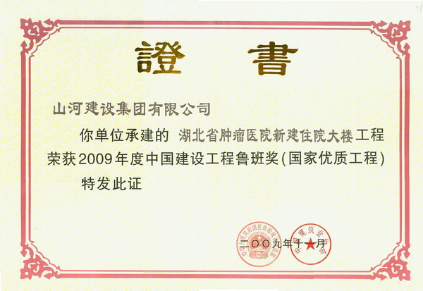 10月26日,中国建筑业协会正式发文,公布了2009年度中国建设工程鲁班奖评选结果。经过初审、复查、公示等过程,共有99项工程获奖,湖北省有3项工程登榜,山河集团承建的湖北省肿瘤医院新建住院大楼项目获此殊荣。消息传来,公司上下一片欢腾。